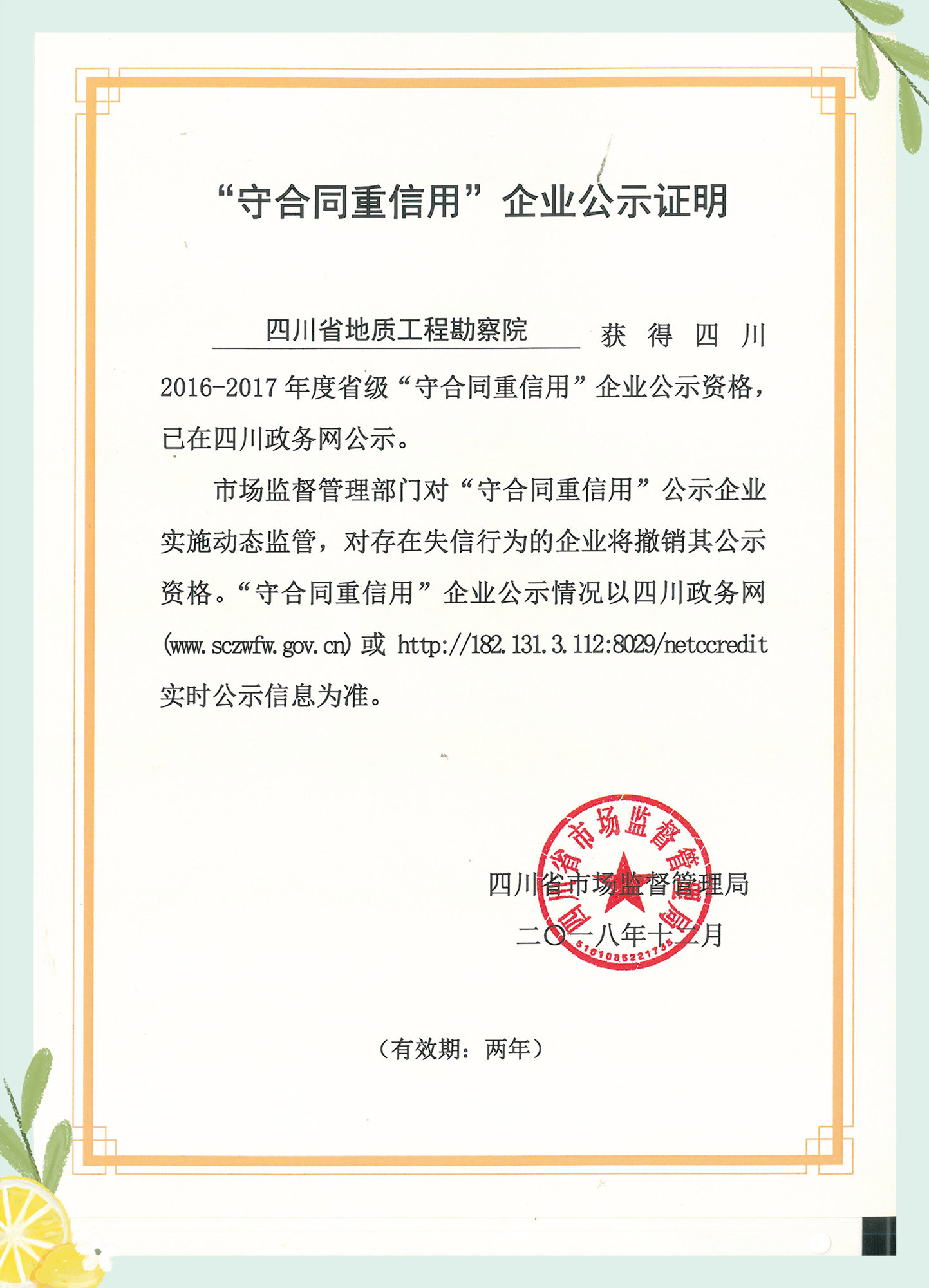 近日,經(jīng)四川省市場監(jiān)督管理局評比公示,我院再次獲得四川省“守合同重信用”企業(yè)稱號。我院自2006年開始參與“守合同重信用”企業(yè)的評選活動以來,至今已連續(xù)12年未間斷獲評“守合同重信用”企業(yè)。